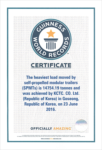 KCTC는 해당 선박블록을 SPMT 324축을 이용하여 Floating Dock로 선적 후, 잠항선을 이용하여 싱가폴까지 무사하게 운송 하였습니다. 이번 작업으로 우리 KCTC는 Guinness World Records의 The Heaviest Load Moved By Self-propelled modular trailers(SPMTs) 항목에서, 기존 Record Holder인 Lamprell의 13,191톤 세계 기네스 기록을 갱신하며, 새로운 기네스 Record Holder로서 세계로 이름을 알리게 되었습니다.